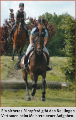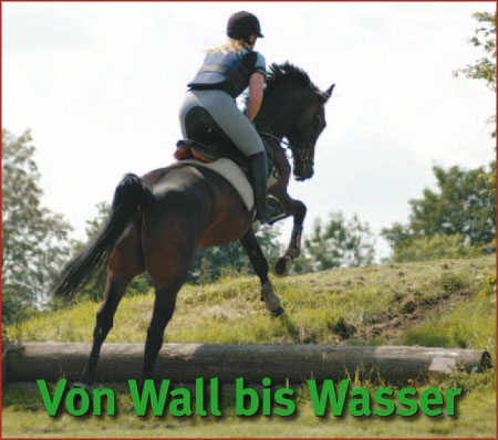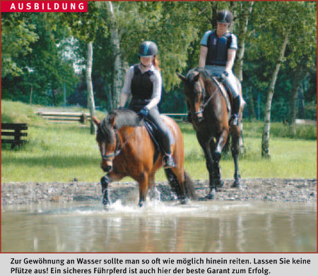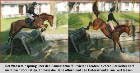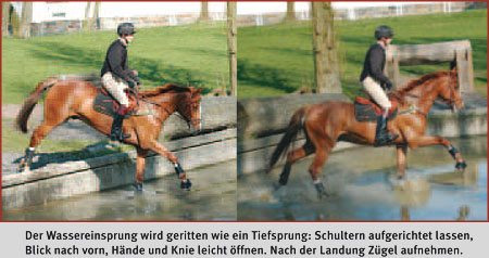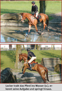 Schritt für Schritt ins Wasser „Anfangs sollte man sich einen ganz flachen Wassereinritt suchen, an dem der Grund griffig ist und das Wasser nicht zu tief wird. Ängstliche Pferde lässt man kurz gucken und folgt dem Führpferd im Schritt direkt ins Wasser. Dabei muss man auch auf einen Sprung über die Einstiegsstelle gefasst sein, wenn sich das Pferd überwindet“, weiß Ostholt. Hat sich der Vierbeiner ans Wasser gewöhnt, wird es auch im Trab oder Galopp durchritten. Später folgt dann der erste Aussprung: „Am besten geht es an einer flachen Stelle über einen kleinen Baumstamm hinaus. Über denselben Stamm kann man nachher auch ins Wasser hinein springen. Denn es bietet sich genauso wie bei Gräben an, die Hindernisse von beiden Seiten zu absolvieren. Dadurch ergeben sich immer neue Aufgabenstellungen“, so Ostholt Falls vorhanden, kann man später auch das Aus- und Einspringen an einer kleinen Kante trainieren. In diesem Fall wird genauso angeritten wie bei Auf- und Absprüngen. „Man lässt den Aussprung an der Kante ganz gelassen auf sich zukommen, aber ohne das Pferd allein zu lassen“, so Ostholt. Der Vierbeiner soll seine Aufgabe erkennen und zunehmend selbstständig meistern. Das gilt ebenso für den Wassereinsprung von der Kante. „Man beginnt aus dem Trab, bis das Pferd am Einsprung nicht mehr zögert“, empfiehlt der Leiter des Bundesleistungszentrums. Für den Reiter ist auch hier der Blick nach vorn,die leicht offenen Hände und die sichere Schenkellage am Gurt wichtig. Einmal Wasser, immer Wasser?
