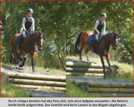 Wallab- und Tiefsprünge Für einen Tiefsprung oder einen Wallabsprung brauchen Pferd und Reiter viel Vertrauen. Das Tempo sollte nicht zu flott sein. Anfangs kann aus dem Trab oder sogar aus dem Schritt angeritten werden. So kann sich das Pferd alles in Ruhe ansehen, bevor es mit einem ersten Schritt nach unten geht. „Das Pferd lernt, ruhig herunter zu gehen und nicht nach oben abzuspringen. Der Reiter sollte nach vorn sehen und die nächste Aufgabe im Blick behalten. Dadurch bleibt der Oberkörper aufgerichtet. Man muss aber aufpassen, dem Pferd nicht in den Rücken zu fallen“, so Ostholt. Wichtig ist, etwas hinten zu bleiben und die Schultern aufgerichtet zu lassen. Der Pferderücken wird entlastet, das Gewicht bei der Landung auf beide Steigbügel, nicht auf die Knie, verteilt. Dafür muss die Steigbügellänge unbedingt stimmen. „Damit sich das Pferd ausbalancieren kann, wird die Hand leicht geöffnet. So gleiten die Zügel so weit wie nötig hindurch, das Pferd hat Bewegungsfreiheit. Nach der Landung wird die Hand wieder geschlossen und der Zügel aufgenommen.“ Tiefsprünge aus dem Galopp sollten übrigens nicht zu häufig geübt werden, da sie die Vorhand des Pferdes belasten.