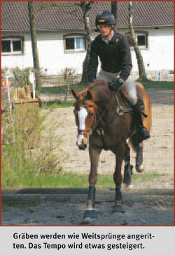 Mit Schwung über Gräben Gräben stellen keine besonderen Anforderungen an das Springvermögen, wohl aber an die Taxierfähigkeit. Am besten versucht man es anfangs mit einem natürlich aussehenden Graben, der nicht besonders tief und breit ist. Anreiten sollte man dieses Hindernis wie einen Weitsprung: „Der Blick muss wieder nach vorn gerichtet sein, auf die andere Seite des Grabens. Schauen Sie nicht nach unten“, erklärt Frank Ostholt, der weiß, dass sonst der Überblick verloren gehen und der Oberkörper nach vorn fallen kann. „Fangen Sie ruhig erst aus dem Trab an und steigern das Tempo dann. Auch vom Hindernis weg werden die Galoppsprünge leicht vergrößert. Das schafft Vertrauen und die Pferde lernen, nach dem Sprung wieder nach vorn anzuziehen“, so der Sieger des CCI**** Luhmühlen. „Wird das Pferd zögerlich, muss man hartnäckig bleiben. Nicht mit Gewalt, sondern mit Konsequenz.“ Sprich: die letzten Galoppsprünge vor dem Sprung richtet man den Oberkörper etwas auf, hält das Pferd vor dem Schenkel und vermittelt ihm damit Sicherheit. Überbaute Gräben werden ebenso angeritten wie offene. „Oft fallen sie dem Pferd leichter, weil es den Sprung besser taxieren kann und die Flugkurve automatisch erhöht wird.“