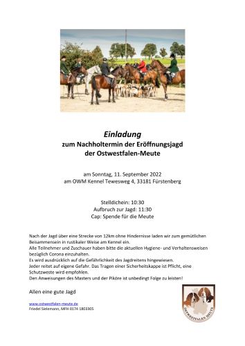 Im zweiten Anlauf soll es jetzt am 11. September, Sonntag klappen: Nachdem die ursprünglich schon im August geplante Eröffnungsjagd der Ostwestfalenmeute abgesagt werden musste, wird jetzt neu durchgestartet - mit einer bis dahin hoffentlich wieder gesundeten Schleppenlegerin. Heike Sielemann hatte sich im Training verletzt und steht jetzt bald wieder auf zwei Beinen.