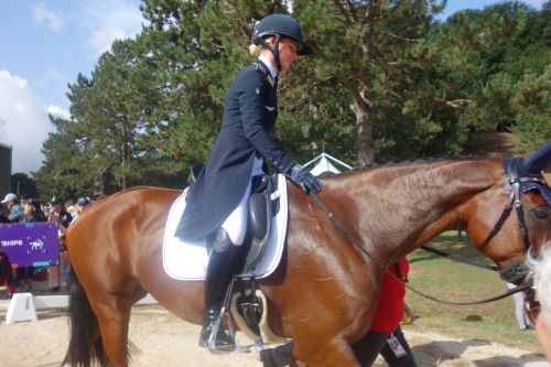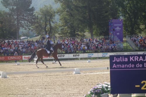 „Sehr zufrieden“ war Julia Krajewski mit ihrem Ritt, der für Amande de B’Neville mit 26 Punkten bewertet wurde und sie zunächst auf den vierten Platz hinter der Spitzengruppe des ersten Tages brachte und am Ende Platz 12 bedeutete. „Viel besser kann sie nicht gehen. Sie ist ja nun mal eher ein Springpferd. Ich wollte um die 25 erreichen und das hat geklappt.“ Die Trabverstärkungen waren Höhepunkte und die Galoppwechsel vom Feinsten. Der Schritt in der zweiten Hälfte dafür eher bedenklich. „Die Aufgabe ist sehr lang. Die drei Minuten in Tokio kamen uns eher entgegen. Damit waren wir schneller fertig.“ Die ehemalige Sportsoldatin der Bundeswehr ritt im Uniform-Frack mit ihren Rangabzeichen als Hauptgefreite, nachdem sie für die Vorbereitung auf Pratoni die Möglichkeit einer Wehrübung in Anspruch genommen hatte. „Die Bundeswehr tut sehr viel für den Sport. Da will ich mit dem Tragen der Uniform etwas zurückgeben.“