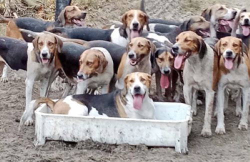 Freitagmittag: bei typisch irischem Wetter trifft man sich vor dem Hotel Aselager Mühle zum Stelldichein. Zu den Klängen der Krefelder Parforcehorn Bläser geht es zur ersten Schleppe der Wildjagd in Westrum. Die Hunde bewiesen wieder wie fit sie sind: schnell, mit exzellenter Nasenarbeit, spurtreu und laut dem Schleppenleger folgend, werden mehrere Schleppen schnell und kurvenreich geritten.