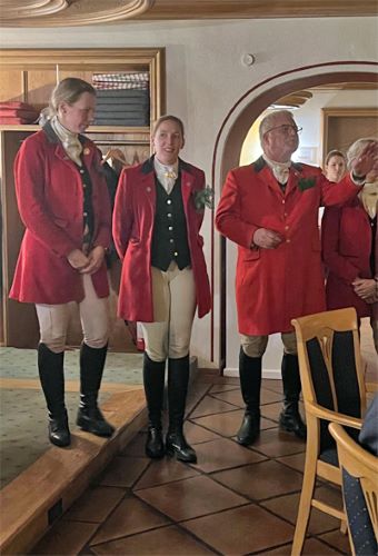 Annika Deckena und Antje Sander sind in diesem Jahr jeweils Ihre 200. Jagd hinter der Cappenberger Meute geritten und für herausragende 400 gerittene Jagden hinter der Cappenberger Meute erhält Jan Sievers die Ehrennadel.
