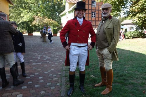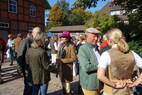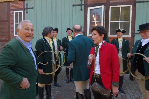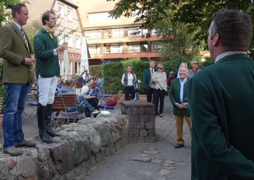 Samstag strahlte die Sonne mit dem Jubilar um die Wette. Die Bläsergruppe aus Usedom um Daniela Heuer hatte sich verstärkt mit zwei tonangebenden Kräften der „bien aller“ aus Verden und setzte den musikalischen Rahmen auf dem Hof vor der Mühle, wo Master Jens Möllering die Mitglieder und Freunde des HSJV willkommen hieß, darunter auch eine Abordnung der Niedersachsenmeute mit Master Cosimo von Dungern zu Pferd und eine ansehnliche Fußtruppe des Rheinisch-Westfälischen Schleppjagdvereins mit ihrem Master Christian Coenen. Diese drei „Alteingesessenen“ verbindet eine besondere Freundschaft in der deutschen Meutelandschaft.