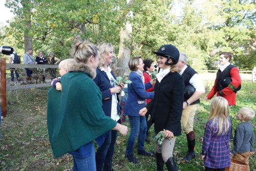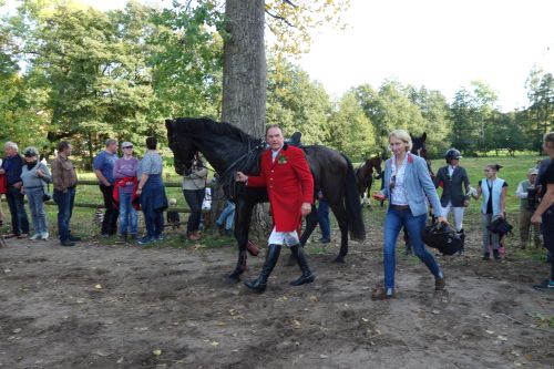 Besonderes Augenmerk verdienten die beiden Schleppenreiterinnen: Anke Voigtländer mit ihrer Tochter Cathrin. „25 Jahre Schleppen-Erfahrung“ hatte Jens Möllering die Witwe seines Vorgängers Ernst-Günther Voigtländer (1994 bis 2004) angekündigt. Aber das war es nicht, was Hochachtung einforderte. Es war vielmehr ihre Eleganz und die Leichtigkeit mit der sie ihr fünfjähriges Pferd bei seiner ersten Jagd vorneweg über alle Sprünge brachte, einschließlich des berüchtigten Halali-Sprunges in die Wiese am Hof. „Da hat er weniger geguckt als vor den viele Zuschauern, die daneben standen,“ freute sich die Reiterin über ihren Zucht- und Ausbildungserfolg. Dass ihre Tochter ebenfalls ein von ihr gezüchtetes Pferd ritt sei nur nebenbei bemerkt. „Alles selbstgemacht“, das hatte da eine ganz besondere Bedeutung – und war eine der vielen prächtigen Rosen wert, die Uli Deus beim festlichen Dinner am Abend nach der Jagd an besonders verdiente Damen überreichte. Weitere Rosen gingen unter anderem an Adelheid Dreckmann, auf deren Gut Rohlfshagen der HSJV seit 92 Jahren (!) jagt und an Elisabeth „Lizzy“ Fischer, die das gesamte Festwochenende sorgsam bis ins letzte Detail orchestriert hatte.