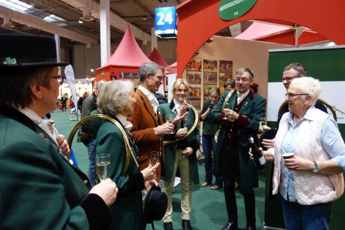 In großer Formation und voller Lautstärke waren nicht nur die 18 Koppeln Foxhounds dabei sondern auch die Bläser der bien aller, die zu zehnt die Fanfare der Niedersachsenmeute bliesen. Seit wann die Meute mit Master Camill von Dungern in Hannover auftritt? Daran können sich weder der Master noch Ursel Bülthuis noch erinnern. Aber seit den Anfängen ist sie jedenfalls die „Hausherrin“ an dem Stand, der von Jahr zu Jahr schöner wird. Freigebig mit Sekt und Keksen, als Info-Börse, immer gut gelaunt mittendrin – und als Beritt-Geberin für Felix Schliephake als Schleppenleger außerdem.
