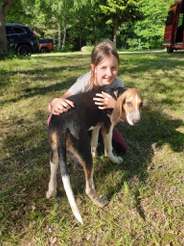 Die Hardt Meute hatte sich eine ganz besondere Überraschung einfallen lassen: Master Andrea Wiehn kam mit neun Welpen aus der Meute im Alter zwischen 3 und 6 Monaten zur Reitanlage und nach einem kurzen Spaziergang ging es dann ebenfalls zur Kaffeetafel im Wald. Wir Erwachsenen tranken Kaffee und aßen vom herrlichen Kuchen, während die “Kleineren“ wenig Zeit zum Essen hatten. Sie spielten begeistert mit den Hunden.