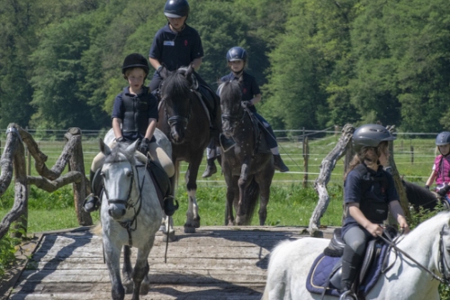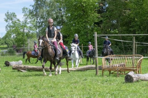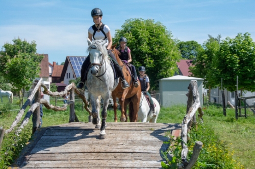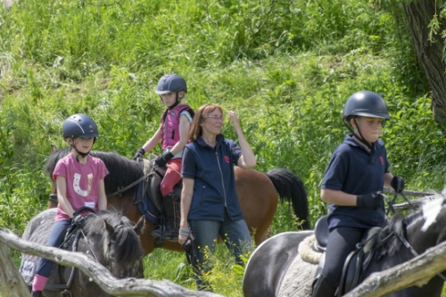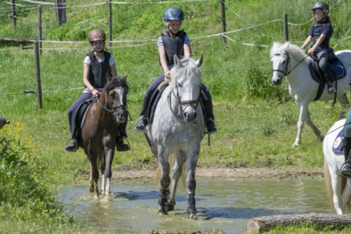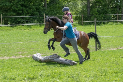 Bettina startete zunächst mit den jüngsten Anfängern auf dem „Geländeplatz“ des Hofes. Dort befand sich alles, was man zum üben für einen solchen Lehrgang benötigt: Von kleinen Baumstämmen bis zu einem zehn Meter langen Wassergraben und einer Brücke. Geführt von den Eltern und Helfern übten die Kleinen im Schritt und im Trab über die Baumstämme, die Brücke und durch das Wasser zu gehen, wobei die Helfer zum Teil durch enorme sportliche Höchstleistungen beim Führen auf sich aufmerksam machten.