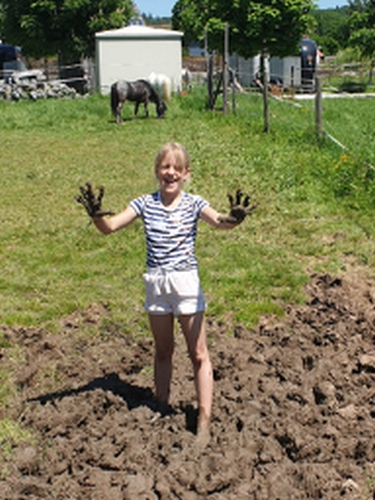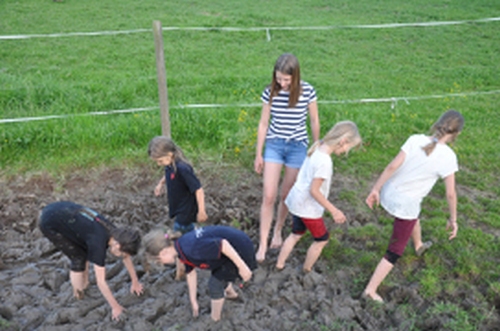 Nach der langen wunderschönen Pause spazierten wir zurück zur Reitanlage. Dort erwartete uns bereits der Grillmeister, der schon die ersten Würstchen und Koteletts aufgelegt hatte. Die Kinder gönnten sich eine kurze Essenspause und setzten dann ihr Vorhaben vom Nachmittag in die Tat um. Sie spielten, sprangen ins Wasser und tollten mit den Meutehunden, die den ganzen Abend bei uns blieben. Wie viel Matsch an einem Kind kleben bleibt! Da staunte mancher nicht schlecht.