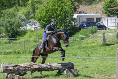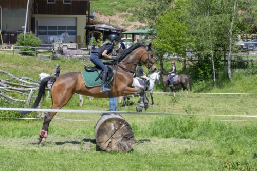 Clemens übernahm die Gruppe der Fortgeschrittenen und ließ sie auf dem malerisch im Wald gelegenen Naturspringplatz in der Nähe der Anlage erste Erfahrungen mit Naturhindernissen machen. Wir als erfahrene Jagdreiter waren von diesen Trainingsmöglichkeiten mehr als begeistert und die Teilnehmer zeigten Freude und zugleich auch Anspannung vor den zu erwartenden Aufgaben.