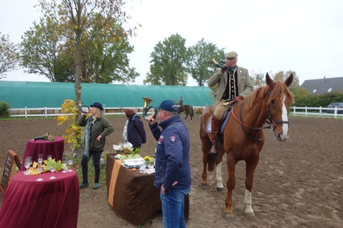 Festliche Begrüßung mit Hornsignalen zu Sherry auf dem Außenplatz an der Reitschule des Ferienhofes in Wietzetze.