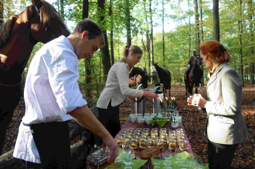 Da reitet man in Begleitung netter Leute durch die herrliche Herbstlandschaft der Göhrde, mit entspannten Pferden und dem Anlass entsprechend nett gewandet plaudernd durch Wald und Heide. Da taucht hinter der nächsten Wegbiegung eine festliche Tafel auf und Meisterkoch Max Schulze und sein Team vom Hotel Pferdeschulze zelebrieren Gastlichkeit in Hochform. Mehrarmige Kerzenleuchter, feine Tischwäsche, herbstliche Tafeldekoration. „Lustvoll gelebte Dekadenz“, nannte es einer der Mitreiter. Oder einfach ein Geschenk, an einem Mittwoch - wenn andere arbeiten müssen - sich des Lebens freuen zu dürfen.