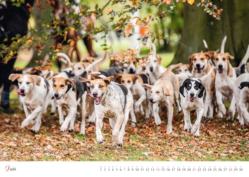 365 Jagdtage im Jahr, das wäre schön – die kann sich der Betrachter leicht zurechtträumen beim Anblick der Ix-Fotos im Format DIN A2 – also GROSS. Jagdmotive auf - mit Deck- und Rückblatt - 14 Seiten: Bis die zusammengestellt sind, fließt einiges an Herzblut. Aus mittlerweile Tausenden von guten Aufnahmen bei seinen Besuchen verschiedener Meuten die Aller-Allerbesten herauszusuchen, das ist schwierig. Und es ist auch nur eine kleine Hilfe, dass kalenderverdächtige Bilder schon im Laufe des Jahres in einen speziellen Ordner wandern.