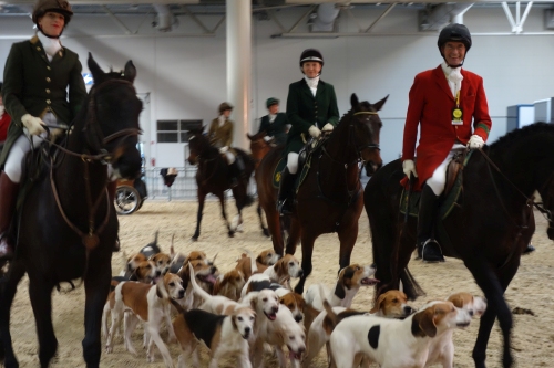 Sieben Pferde begleiteten die Foxhounds, die den Großen Ring lautstark füllten und die Schleppe von v.Dungerns Enkeln Cosima suchten. Und das jagdliche Flair kam vollends auf durch die Signale der „bien aller“ aus Verden, die mit elf Bläsern angetreten waren.
