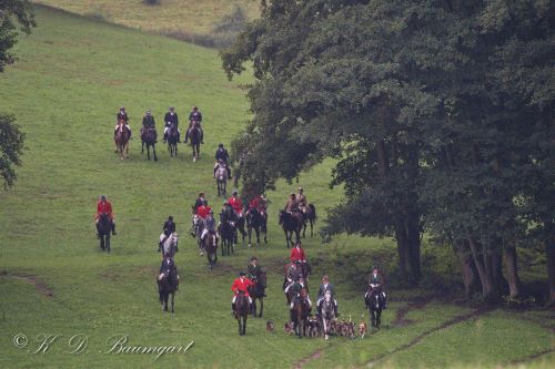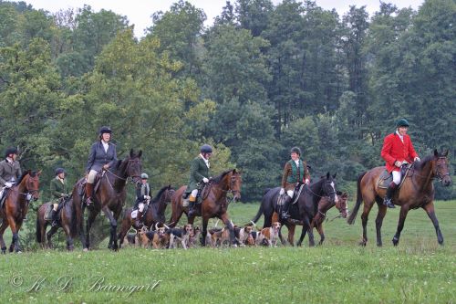Am Sonntag schien im Gegensatz zum Vortagschien die Sonne morgens wieder hell und die Jagdherrin Sabine Rothe begrüßte die große Jagdgesellschaft auf ihrem Gut, wie immer herzlich und mit Bläsern aus Mecklenburg.Aufgrund des starken Regens in den Tagen zuvor, wurde die Jagdstrecke kurzerhand in die wildreichen benachbarten Mischwälder verlegt. Ein an Abwechslung nicht zu überbietendes Gelände tat sich auf. Auf der Schlussschleppe begleiteten zwei Jagdreiterinnen von den Hamburger Schleppjägern und der Taunusmeute, die Equipage an den Hunden. Auf Einladung von Sabine Rothe endete eine eindrucksvolle Jagd im Restaurant Schafstall.