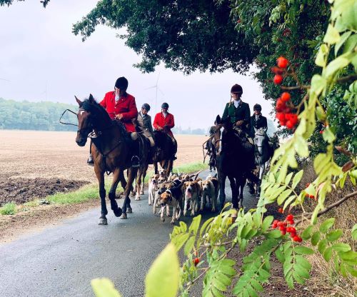 Nach einem stimmungsvollen Stelldichein wurde von den 22 Reitern zunächst eine großzügige Aufwärmstrecke durch das schöne Ostwestfalen im Schritt geritten. Durch den Anblick der herrlichen Natur und das ruhige Umfeld des Jagdfeldes sank meine Aufregung sofort und ich spürte, dass meine fünfjährige Stute sich entspannte und die gemeinsame Zeit genoss. Während der sehr gut angelegten Schleppen auf Wiesen- und Waldböden konnte man durch das kleine Teilnehmerfeld die großartige Hundearbeit, auf die Master Friedel Sielemann größten Wert legt, bestens beobachten. Ich durfte direkt an erster Stelle hinter der Equipage reiten, sodass ich alles beobachten und auch die Kommandos verstehen konnte. Sehr gut ausgebildete und hochkonzentrierte Foxhounds und eine souveräne Equipage leisteten hervorragende Arbeit an diesem Tag. Nur ein einziges Mal verloren die Hunde kurzfristig den Scent, waren aber sofort wieder spurtreu und gaben herzerwärmendes Geläut. Das alles war interessant zu beobachten. Besonders beeindruckt hat mich, dass die Meute sicher von der Equipage geführt wurde und geschlossen zwischen den Pferden lief, auch als zwei junge Rehe unseren Weg kreuzten. Zwei kurze Stopps auf einem Hof und dem Reitstall Finger kamen Pferden und Reitern mit kleinem Umtrunk sehr gelegen. Obwohl die 12 km lange Jagdstrecke ohne Sprünge angekündigt war, freute sich das Teilnehmerfeld über zwei Baumstämme auf einer idyllischen Waldschleppe, die die Freude der Pferde am natürlichen Springen zeigten. Somit kann ich sagen, dass wir beide, Ituanga und ich, nun auch für kommenden Jagden im springenden Feld gerüstet sind und unsere Freude daran entdeckt haben.