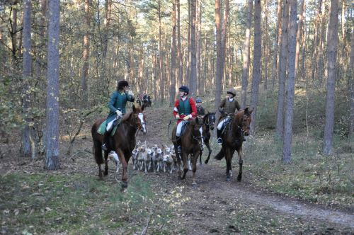 Mechthild von Lucke soll die Schleppen in größere Bögen legen und auch mal durch Unterholz, die Reiter nicht nur hinterher hetzen sondern die Nasenarbeit der Hounds beobachten. Anja Cohrs und Hedda Roggenbuck sind als Anlieger bestens vertraut mit dem Gelände und zeigen der Schleppenlegerin den Weg. Der eine Schimmel ist völlig unerprobt, der andere im Springparcours bis Klasse S zuhause. Beide sind zunächst ziemlich überwältigt von dem ungewohnten Umfeld, aber nach den ersten beiden seeeehr langen Schleppen gut zufrieden, einmal richtig Pferd zu sein und zwischen den Lines auch gerne Schritt zu gehen.