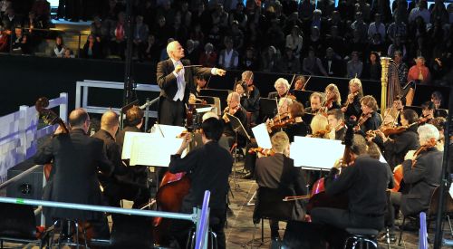Bei den Marbachs Classics suchen die Württembergische Philharmonie Reutlingen mit Dirigent Ola Rudner die Harmonie zwischen klassischer Musik und den Bewegungen der Pferde. Foto: Uschi Pacher